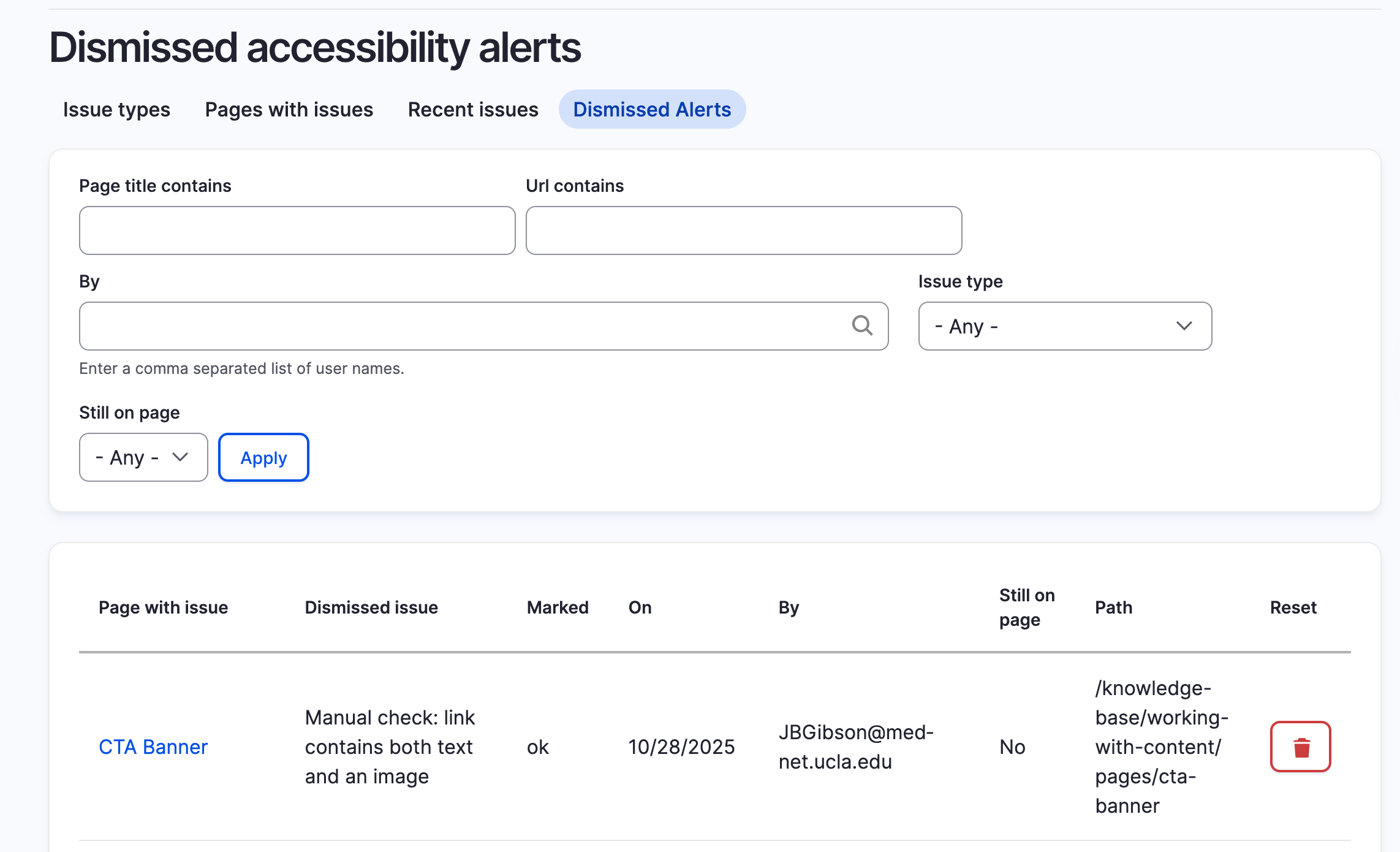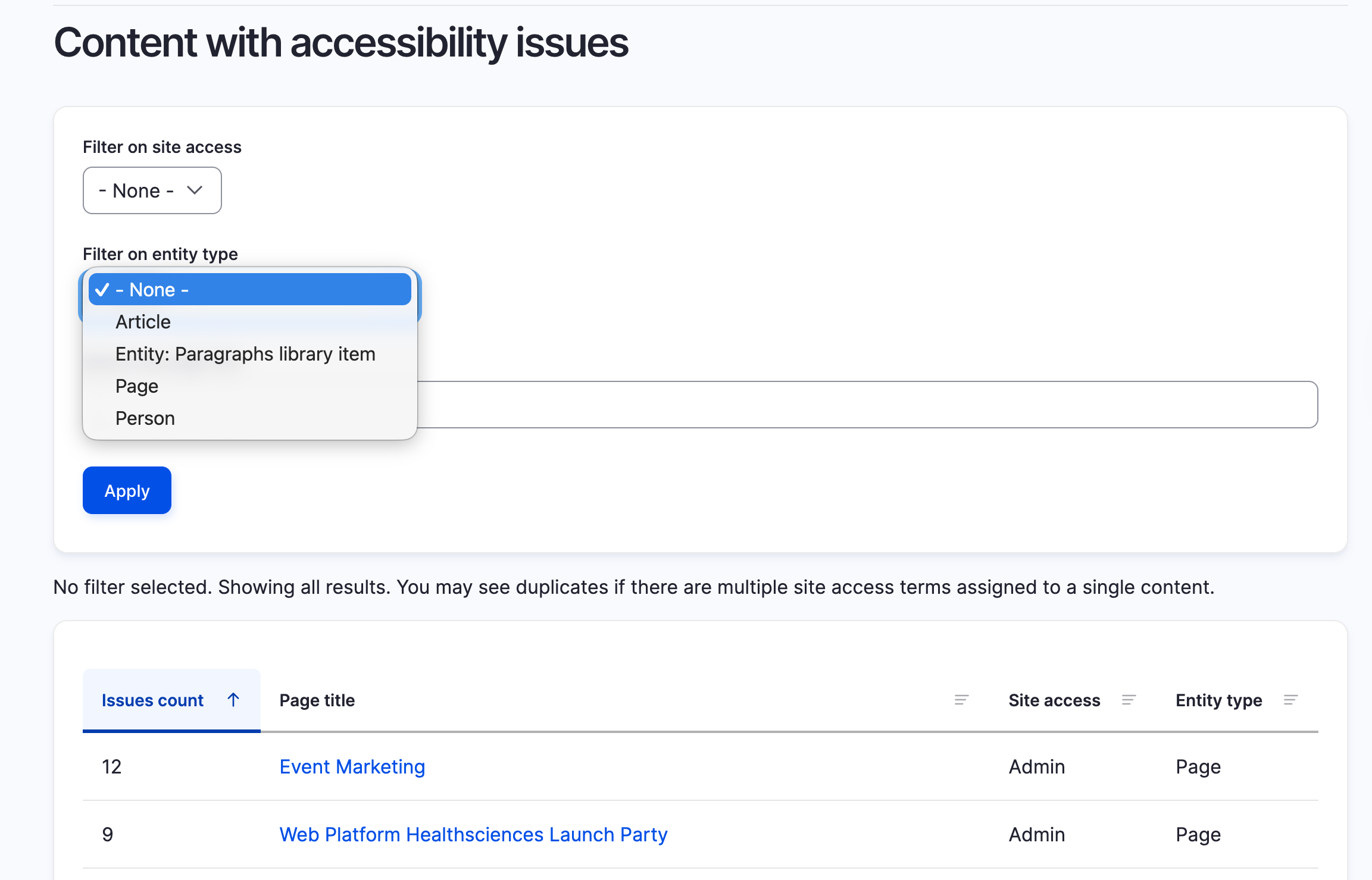 This report shows all content with accessibility issues. You can filter by content type.