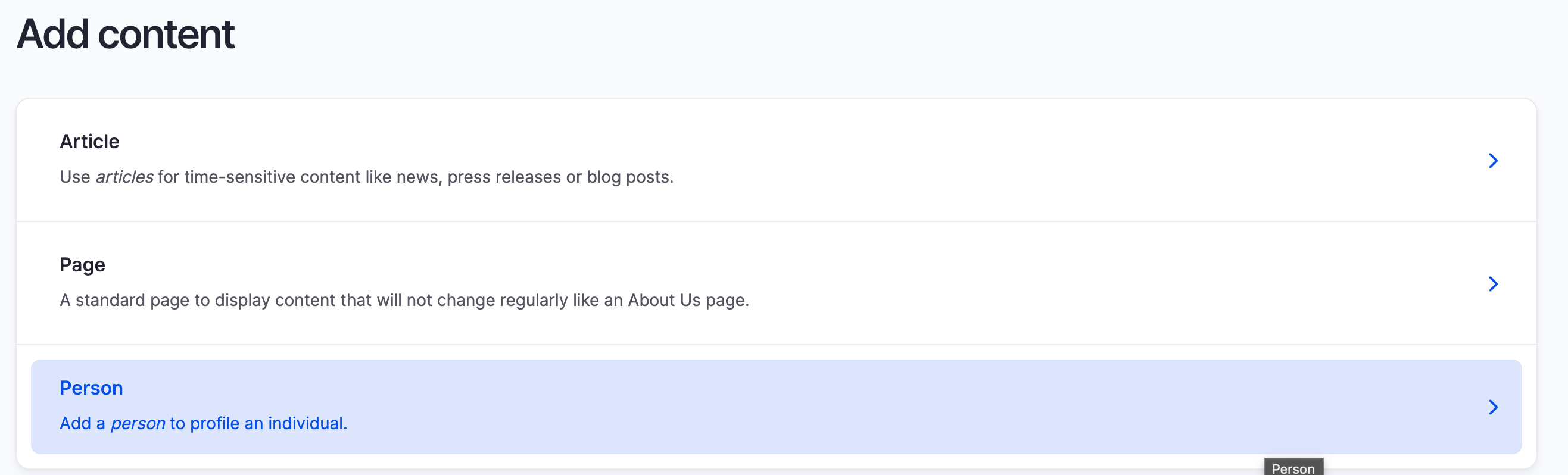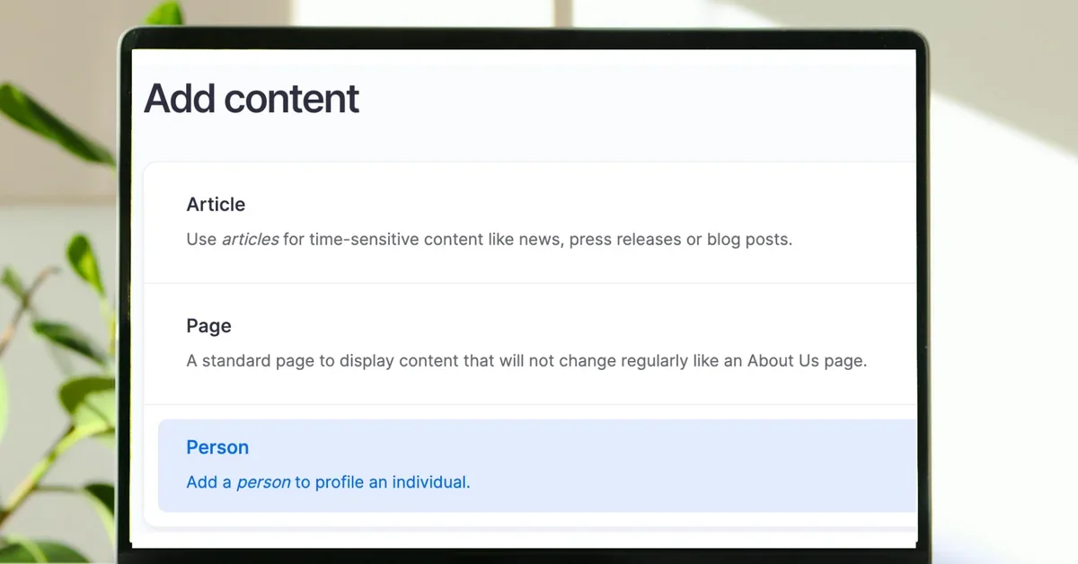 - Event – The listing will dynamically appear in your site if you decide to create any event pages. Person pages can be attached to this content type.