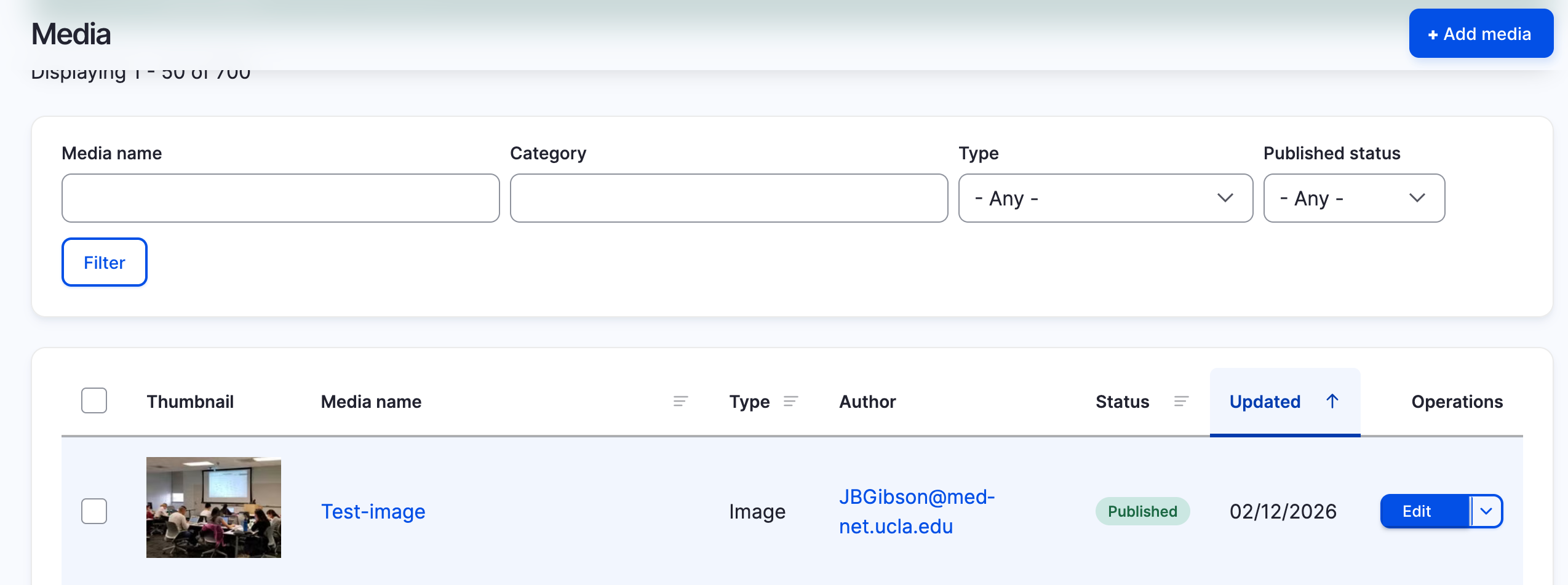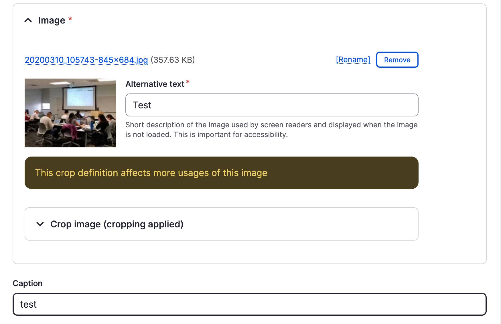- Once the image is added, select the Edit media button to adjust the image cropping, alternative text, or caption.
