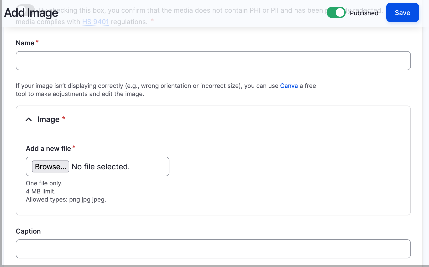 - Enter an image name and alternative text. You will also need to add a Caption if you want to display the image caption.