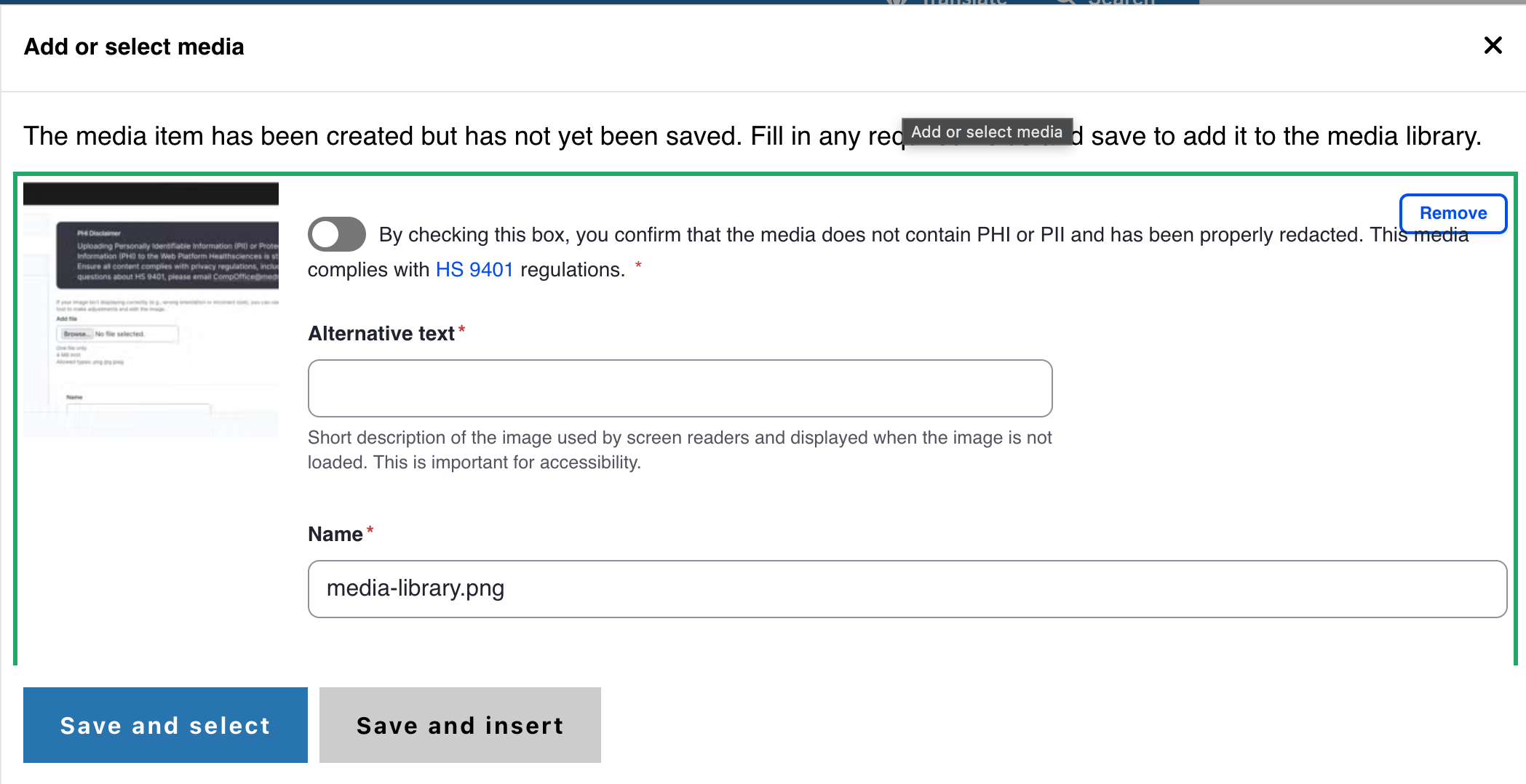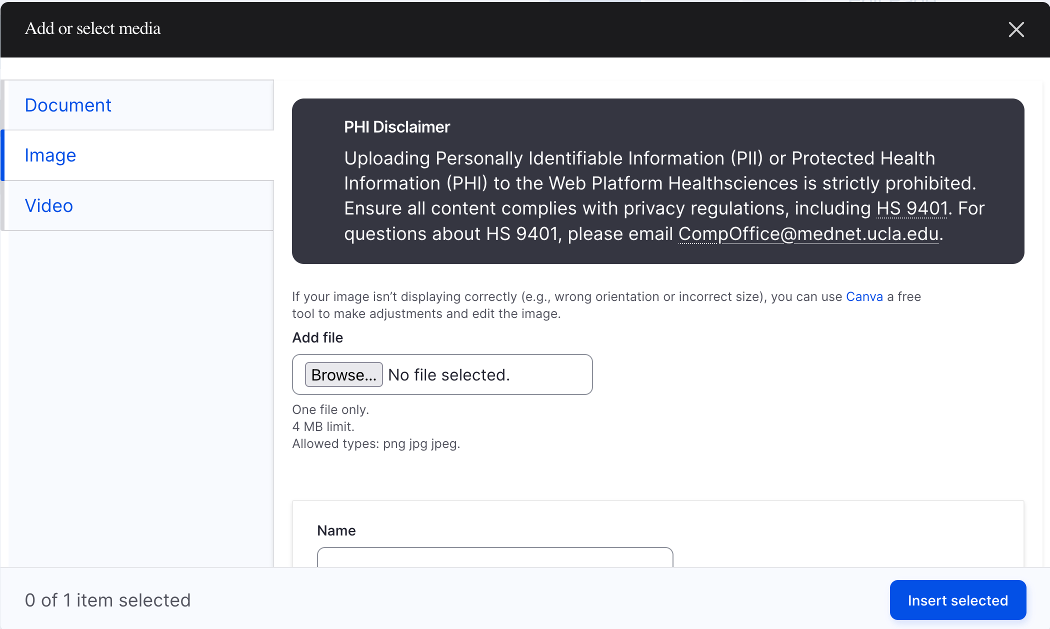 - Select the Choose File button to upload a new image or search and select an existing image. If you upload an image, you will need to add the image alternate text. Then, click Save.