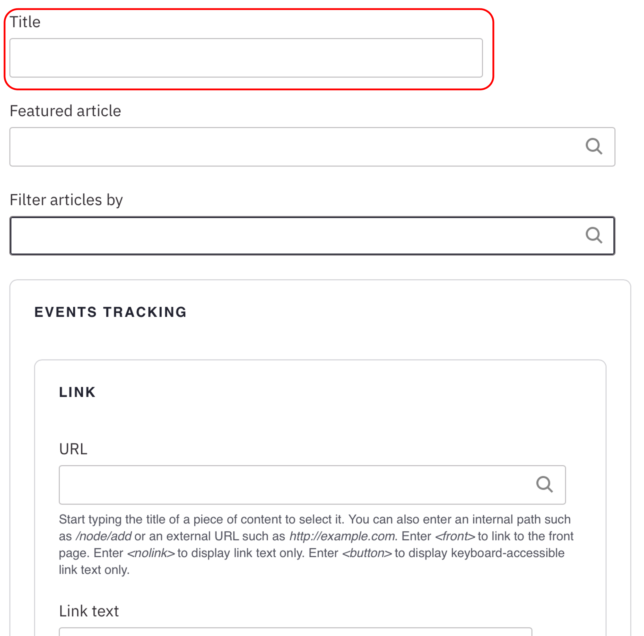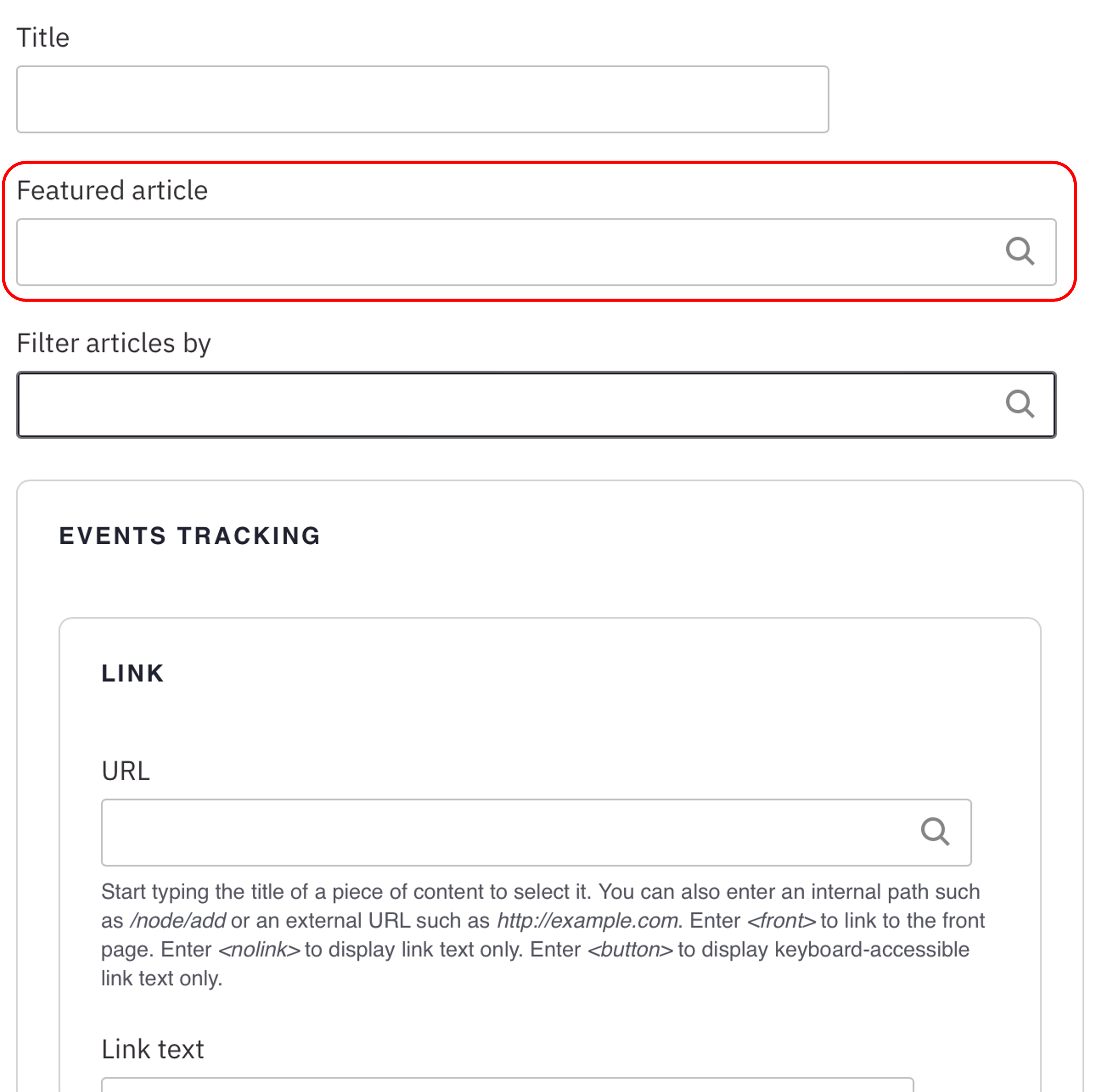 Note: Title field text is limited to 70 characters. - Optional: Feature an article at the top of the list. In the Featured article field, start typing the title. Select the title you want to feature.
