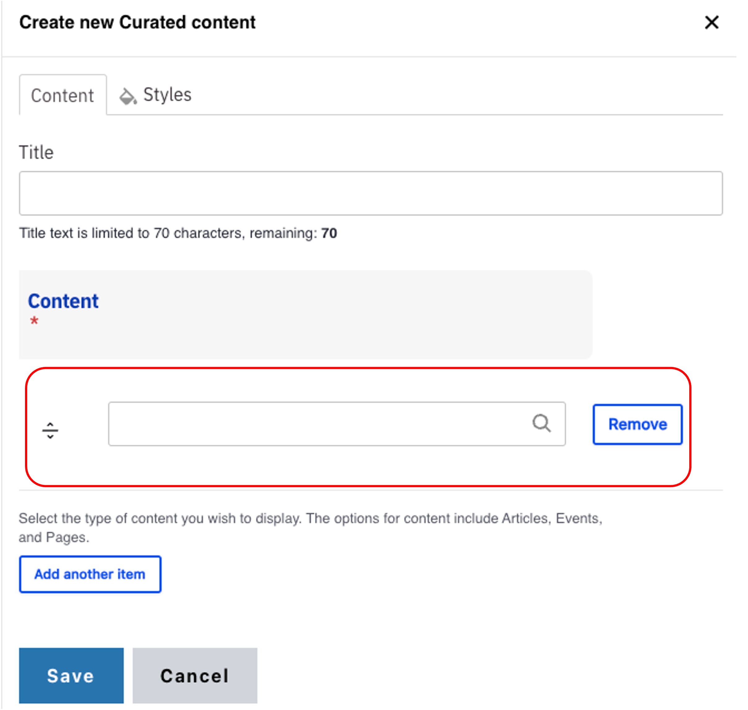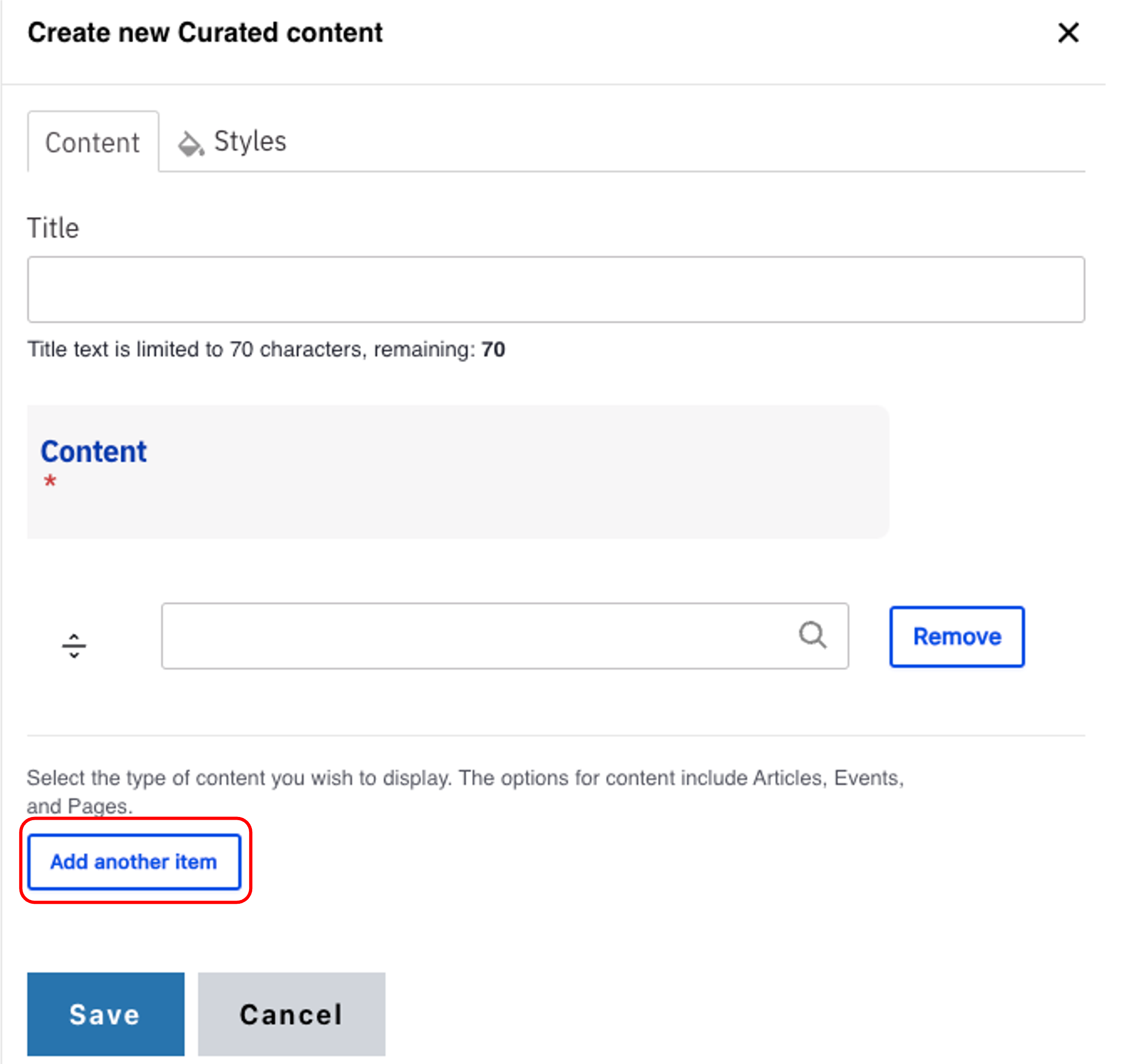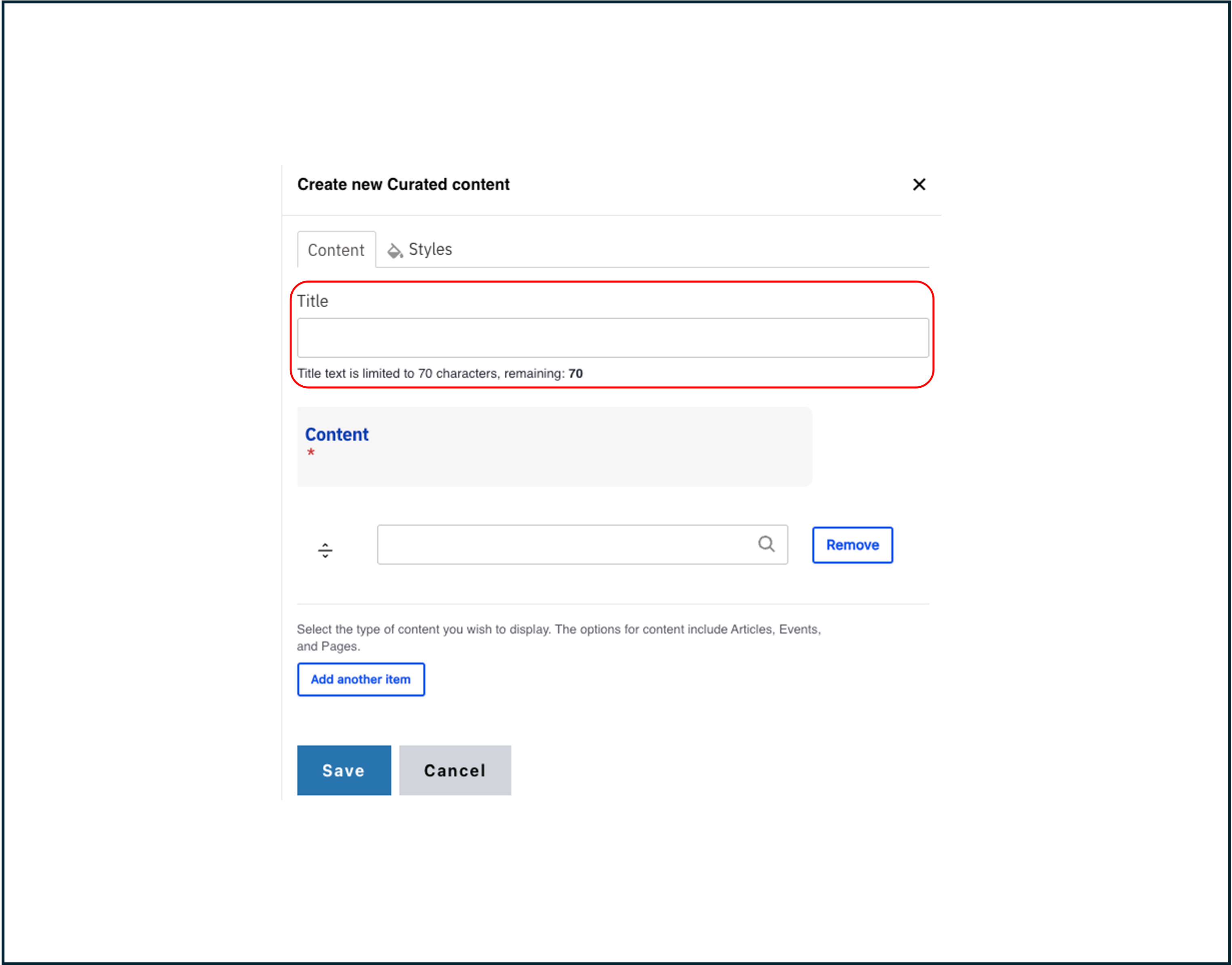 Note: Title field text is limited to 70 characters. - Start typing the name of the page, article or event you would like to add in the Content field.