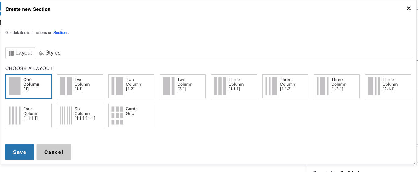 Within Pages (Layout Paragraphs) there are two types of containers to hold your content. You can think of this like tables in software such as Microsoft Word or Excel. First you need to define the number of columns in your row which Pages (Layout Paragraphs) refers to as Sections. You can have up to four columns in a row. Once you have defined the number columns you would like in a Section, you can add a component(s) to each of your columns. A component can hold various types of content, such as images or text. An easy way to think of a component is a unique container that holds a piece(s) of content.