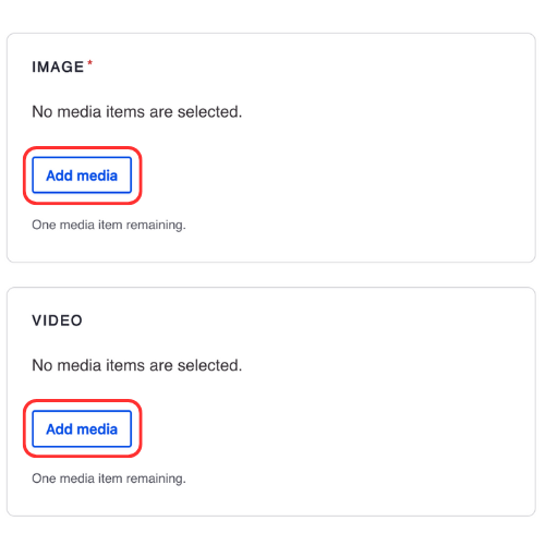 Recommended Image Dimensions: 3:2 - Maximum image size is 4MB. - Click Add media in the video section. When you add a video, a play icon will appear over the image (optional).