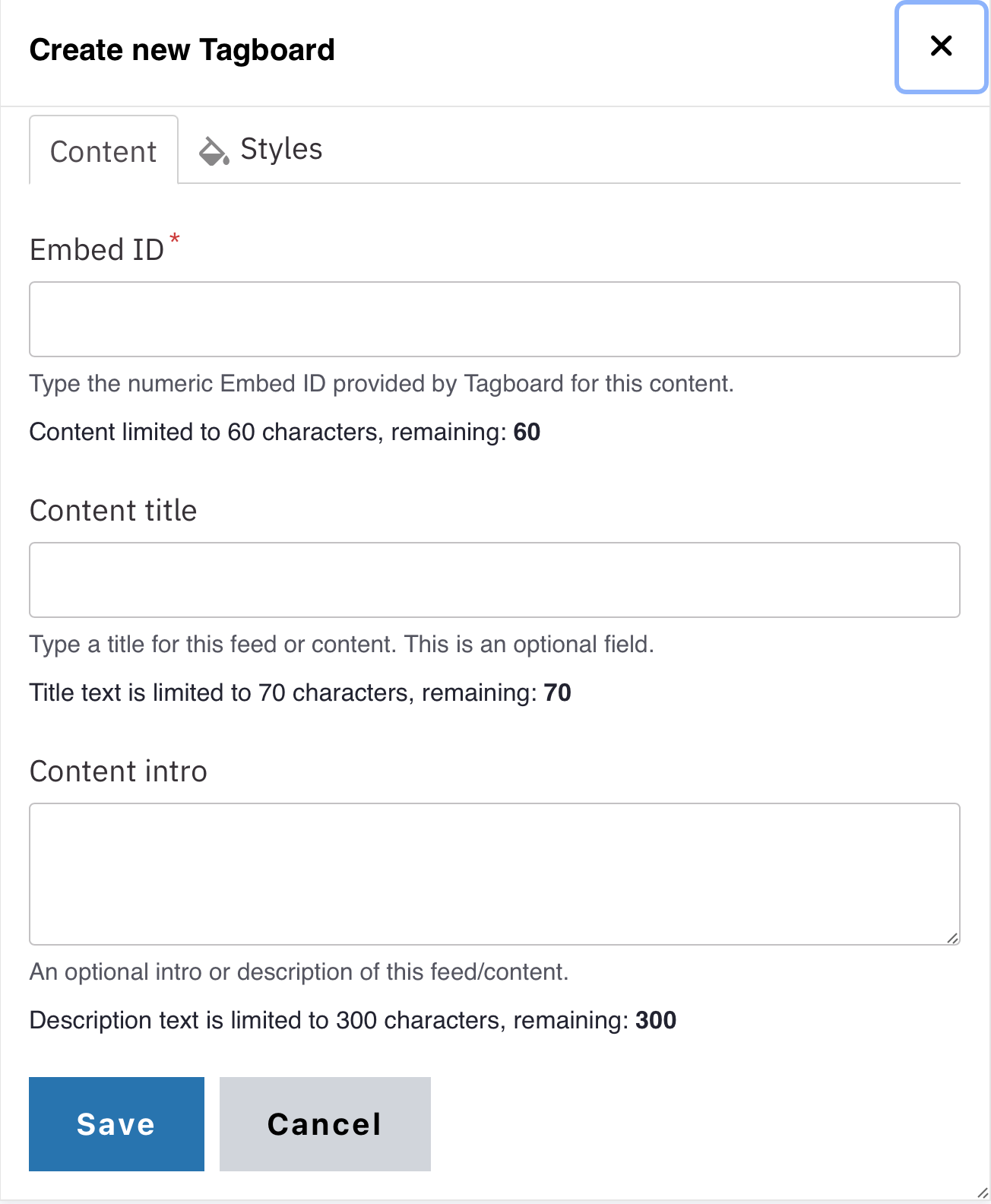 Note: Title field text is limited to 70 characters. - Enter the Content intro of your Tagboard Embed (optional)